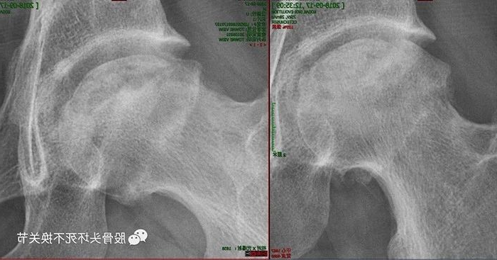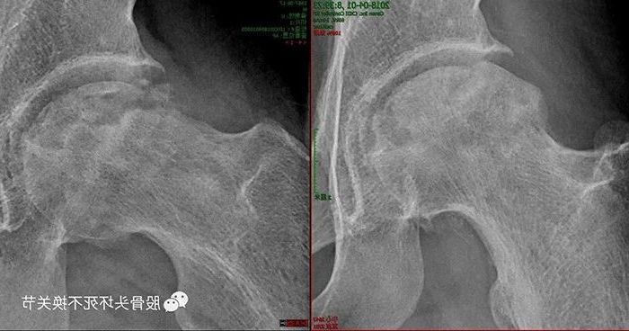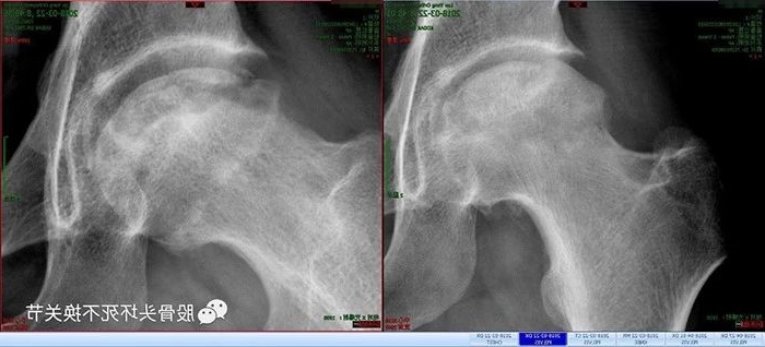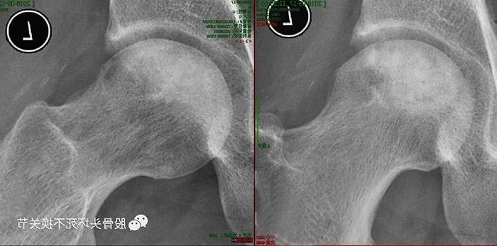 这是患者出院半年以后的状况,右侧股骨头可见囊变区骨密度提高,关节间隙保持完好。